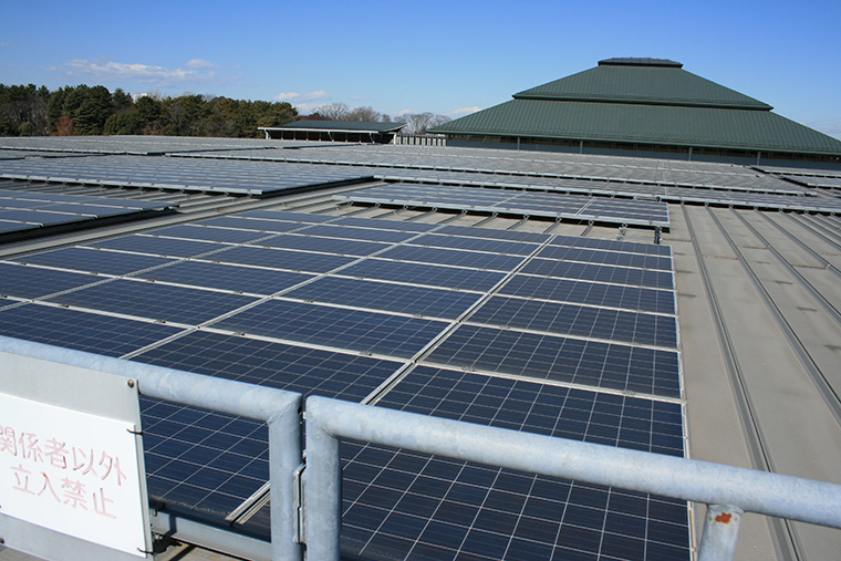 江田:エコアリーナは、パティネレジャーが運営する、冷却設備だけではなく建物、照明、空調も環境にやさしい製品や技術を用いて構成されたアイスリンクの総称です。ここ、埼玉アイスアリーナの例で言えば、製氷設備や場内の除湿に自然冷媒機器を採用し、屋根全体に1,680枚の太陽光パネルを敷き詰めて、電気を作りつつ外側から遮熱する作りになっています。また、ここ以降に建てられたエコアリーナは全て、天井にシーリング加工を施して冷凍機の負荷を軽減させています。