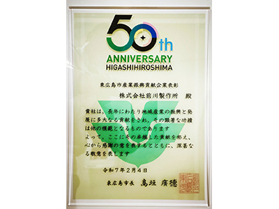 このたび、東広島市の市制施行 50 周年を記念し開催された「東広島市産業振興貢献企業表彰」において、当社東広島工場が地域経済の発展や雇用の促進など産業振興に対し最も貢献した企業34社のうちの1社として表彰されました。