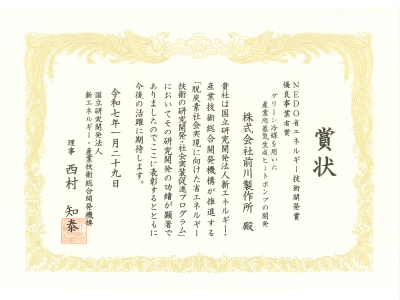 このたび、「脱炭素社会実現に向けた省エネルギー技術の研究開発・社会実装促進プログラム」2022年度追加公募としてNEDO(国立研究開発法人新エネルギー・産業技術総合開発機構)で採択された技術テーマである当社の「グリーン冷媒を用いた産業用蒸気生成ヒートポンプの開発」が「NEDO省エネルギー技術開発賞」において「優良事業者賞」を受賞いたしました。