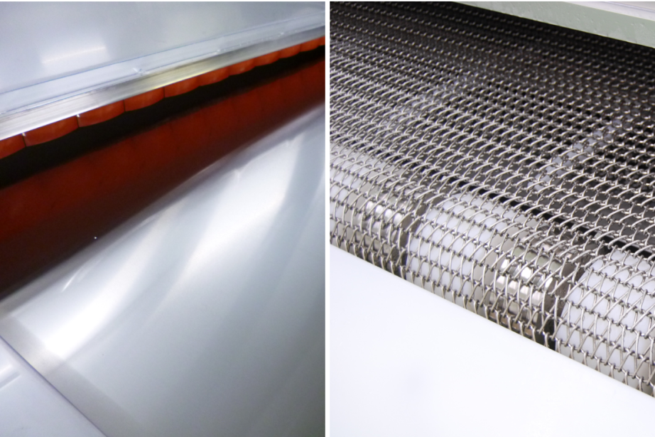 あらゆる製品に適したメッシュベルト、接触面積が大きく、メッシュ跡をつけたくない製品に適したスチールベルト、ベルト跡を残したくない製品に適したプラスティックベルト。より長時間稼働のニーズや、穴あき麺トレー等の水分がベルトに付着しやすい製品に適したフラットワイヤーベルトなど、各種取り揃えています。